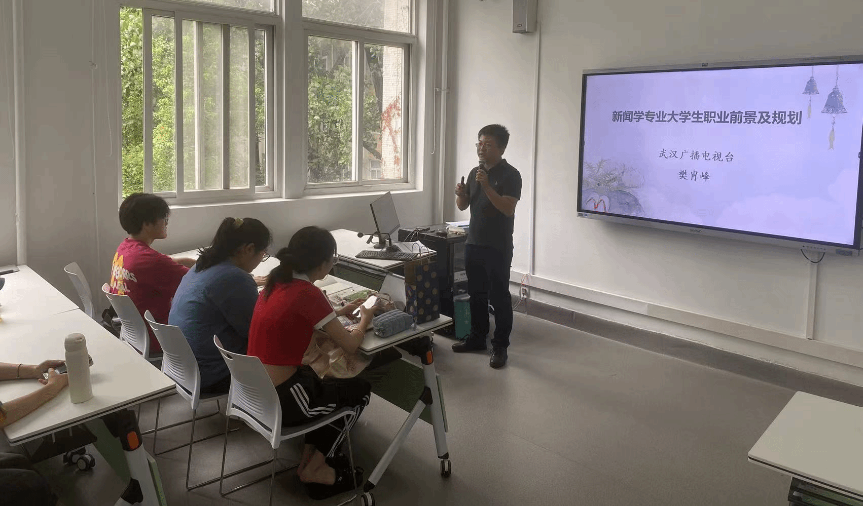 为解决员工学业困惑和行业知识盲区,《新媒体工作坊》创新开设课内传媒人讲堂,采取案例分享与情景式教学相结合的模式,邀请了科大讯飞、极意网络、辉耀映画、武汉电视台等媒体企业的行业员工开展讲座与互动,各位员工以其丰富的行业积累和过硬的专业知识、精彩的讲述和不同的职业发展经历让员工更深刻的明白了“我要学什么?”“将来要做什么”等问题。在圆桌讨论环节,同学们踊跃发言,提出了各种专业见解、学习困惑和人生规范方面的问题。“有些基础课程的学习对今后的就业有多大帮助?”、“现在拍摄短视频的门槛这么低,那我们以后和非传媒专业的员工相比,竞争优势在哪里?”、“您认为AI会彻底取代传媒行业么?”